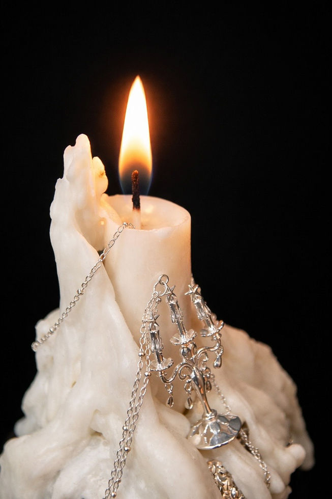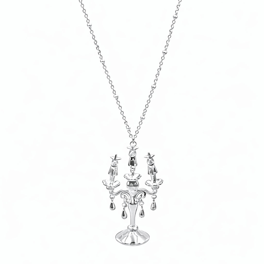 This necklace is shaped around the image of a standing candelabra — upright, symmetrical, and quietly composed. Three slender arms rise from a central column, echoing the stillness of candlelight held in balance rather than flame in motion.