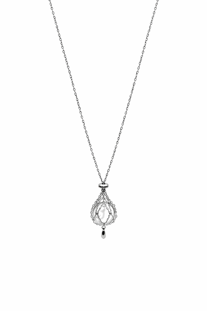 This necklace is defined by a delicate silver structure that gathers rather than encloses. At its center rests a translucent element, held in balance by interlaced chains, suspended between structure and openness.